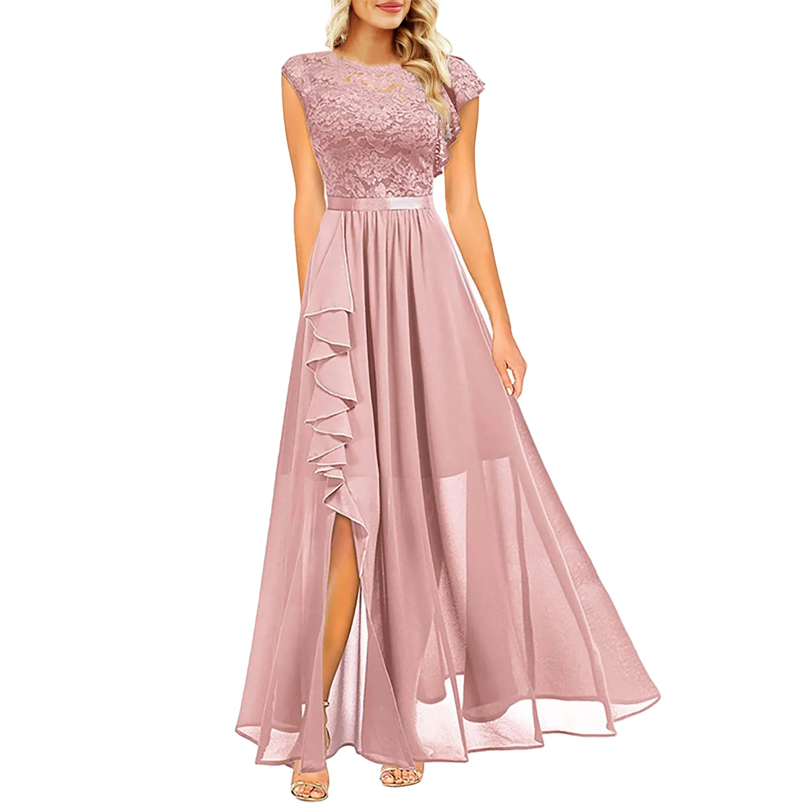 2024 Women's Elegant Long Maxi Dress High Waist Round Neck Party Wedding Fashion Dress Robe Vintage Spliced Lace Chiffon Dress