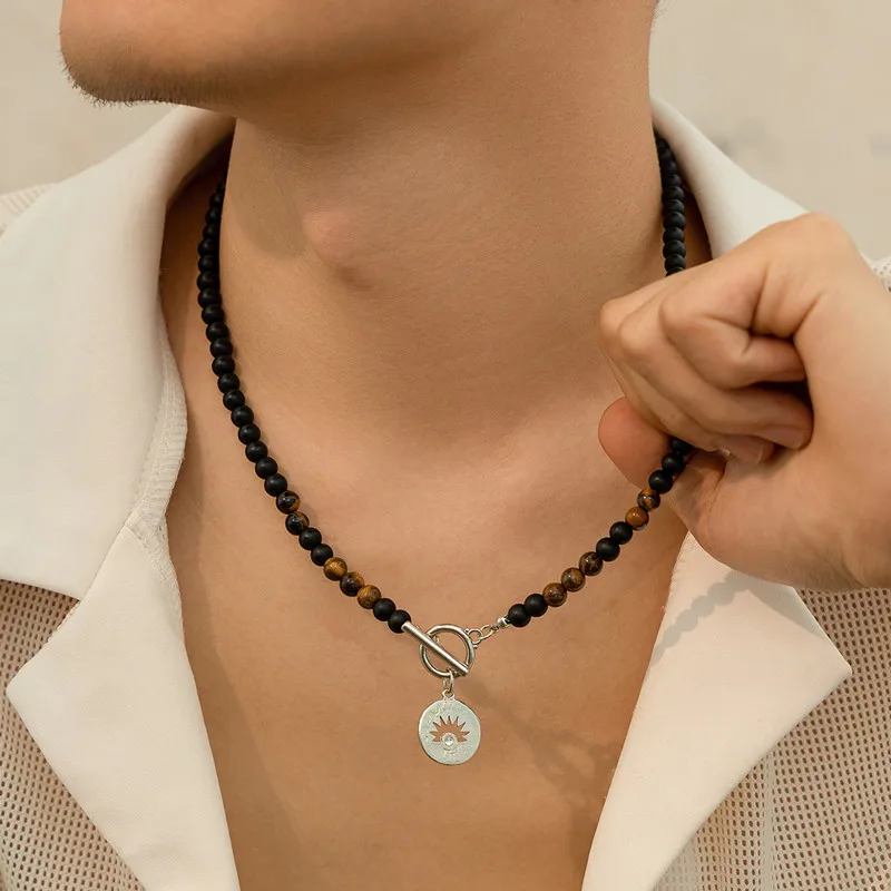 Tiger Eye Stone Beads with Sun Pendant Necklace for Men Trendy Accessories on the Neck Collar Fashion Jewelry Male Gift